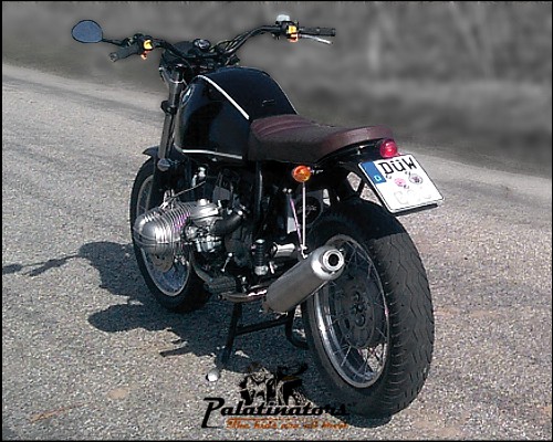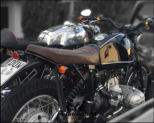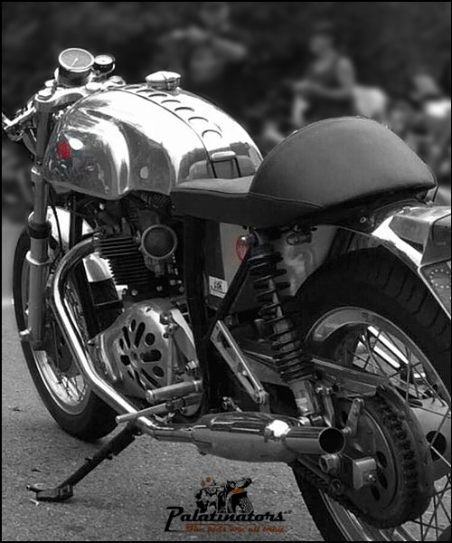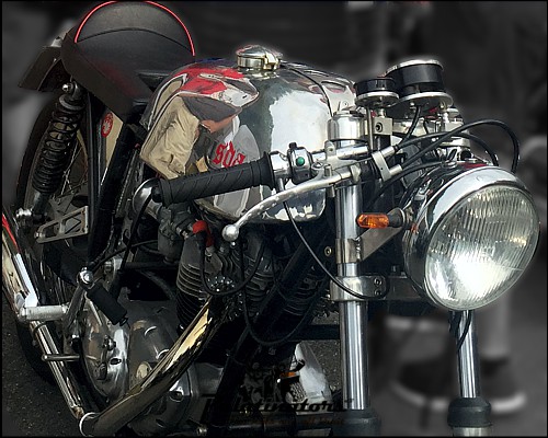 Originally unit construction Bonneville, its engine is heavily modified internally. A Norton Atlas crankshaft with lightened bobweights has been machined to run in standard Triumph main bearings. Polished T140 conrods give a capacity of about 840cc and the flywheel has had its periphery skimmed to give clearance for the lobes of T140 camshafts timed for optimum mid-range torque. The 10 stud cylinder head has been converted to stub exhaust fittings instead of the troublesome push-fit system, and sweptback pipes carry BSA Gold Star pattern silencers in traditional Dresda style. Although of dubious benefit on the road, centrally-disposed spark plugs are fitted in keeping with the unashamedly cafe-racing image of the machine.